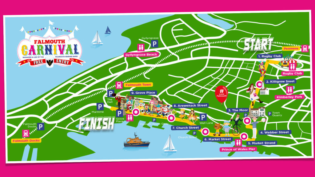 *For participants safety all Floats must return to the Recreation Ground to disassemble or disembark passengers safely by traveling down Marine Crescent, turning right at the Falmouth Hotel and following Melville Road to the Falmouth Rugby Club. All Marching Parade Entrants will finish in the safe havern of Events Square. It is the responsibility of all entrants to find a suitable and safe route home following the end of the Carnival.